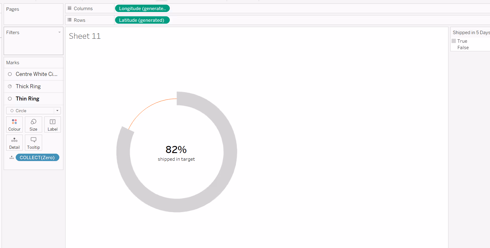 This works best for a boolean true/false or yes/no type split. One value of the dimension splitting the pie (in this case the False option) is coloured white (or the same as the background), and then a central circle is layered on top.