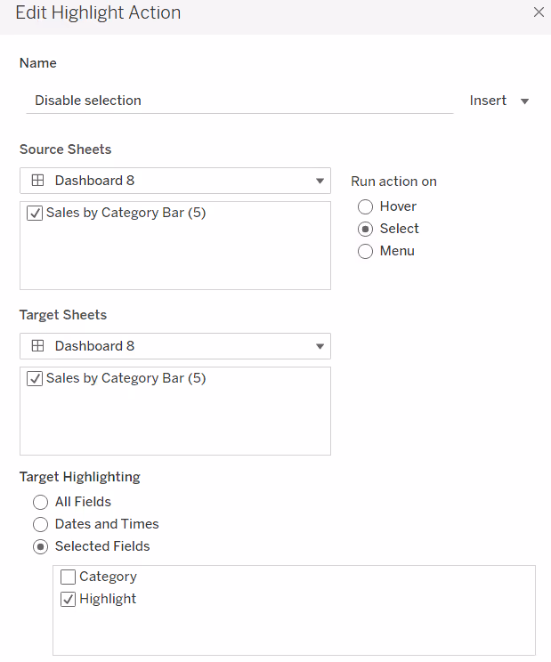 You will also need to adjust the original Filter action, to set the filter to just pass selected fields, in this instance Category (this is because of the addition of the Is Selected Category field onto the Sales by Category chart).