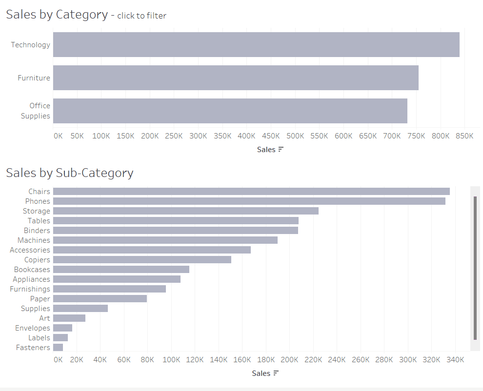 Below is a simple dashboard that shows Sales by Category, and Sales by Sub-Category. Clicking on the Sales by Category chart filters the Sales by Sub-Category chart.