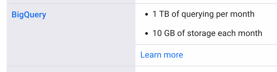 “The BigQuery sandbox lets you explore limited BigQuery capabilities at no cost to confirm whether BigQuery fits your needs.